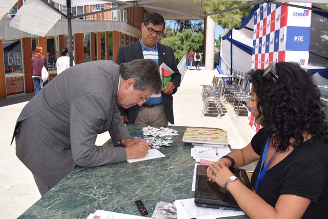 Hasta el stand del Instituto Nacional de Estadísticas, operativo hasta el 20 de enero en el sector de acceso a la Biblioteca Central de la UPLA, llegó el rector Sanhueza junto al director general de Desarrollo Estudiantil (DGDE), Gregorio Silva, a concretar su inscripción.