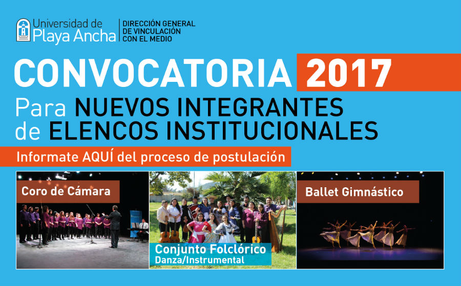 A poco de comenzar con la temporada 2017, los elencos institucionales –a cargo de la Dirección General de Vinculación con el Medio- comienzan a retomar sus ensayos y a recibir nuevos integrantes que formarán parte de estas prestigiosas agrupaciones. Por lo anterior, el “Coro de Cámara”, el “Conjunto Folclórico Puerto Claro” y el “Ballet Gimnástico UPLA”, abrirán en los próximos días sus convocatorias para aquellos interesados en participar.