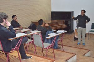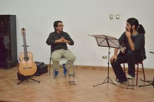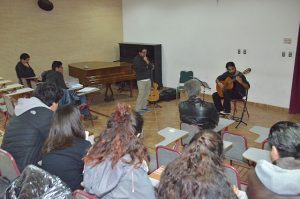 Una vez finalizada la clase expositiva, Renato Serrano procedió a trabajar con dos estudiantes de Música, quienes interpretaron sus respectivos temas que luego fueron analizados por el académico con el propósito que los guitarristas aprendan otras indicaciones y manejen distintas visiones para mejorar cada una de sus piezas musicales.