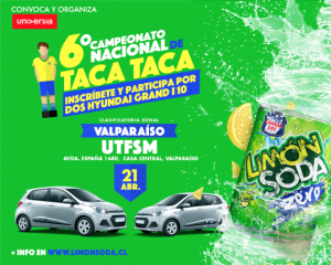 Por sexto año consecutivo se desarrolla el Campeonato Nacional de Taca Taca Limón Soda Universia 2017, cuya quinta fecha zonal se llevará a cabo este viernes 21 de abril en la casa central de la Universidad Técnica Federico Santa María, ubicada en Avda. España 1680, Valparaíso.