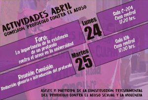 En forma especial se abordará el tema del acoso sexual, con dos actividades: el foro “La importancia de la existencia de un protocolo contra acoso en la universidad” (lunes 24) y una reunión triestamental acerca de la construcción de un protocolo para la UPLA (martes 25).