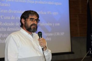 En su conferencia, el Dr. Sánchez se refirió a los sistemas ecomarinos en general (puntualmente al Mediterráneo) y a los problemas que enfrentan, tales como el crecimiento de la población, sobreexplotación de los recursos marinos, y las herramientas para reducir la contaminación y así reducir la presión en los ecosistemas marinos.