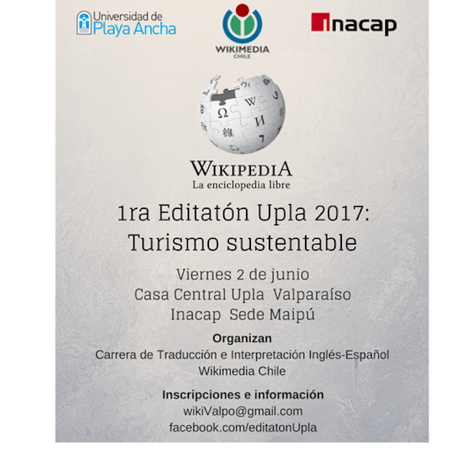 La primera Editatón organizada por la carrera de Traducción Inglés-Español, WikiMedia Chile y la carrera de Traducción de Inacap Sede Maipú se realizará el 2 de junio en el Aula Dr. Félix Morales Pettorino de la universidad.