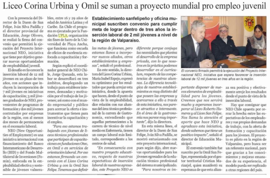 Con la presencia del Director de la Daem de San Felipe, Iván Silva Padilla y el director provincial de Educación, Jorge Olivero, se realizó la firma del convenio que permitirá la ejecución del Proyecto Internacional NEO, iniciativa que tiene por objetivo generar nuevas oportunidades de empleabilidad juvenil.