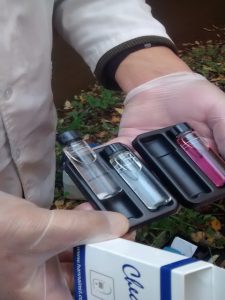 Otra de las actividades conmemorativas fue un muestreo del vital elemento en el estero Las Zorras, lugar que rodea el Parque Quintil y ejecutado por la Dra. Cecilia Rivera que consistió en tomar tres muestras en tres puntos representativos del lugar y medir diversos parámetros tales como la temperatura, pH, conductividad, cloro disueltos, sólidos y cantidad de coliformes totales y fecales.