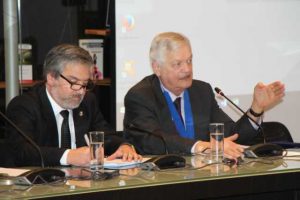 Los encargados de dar la bienvenida a los asistentes al seminario fueron el presidente de la Cámara de Diputados, Fidel Espinoza, y el presidente de la AUR y rector de la Universidad de Playa Ancha (UPLA), Patricio Sanhueza.