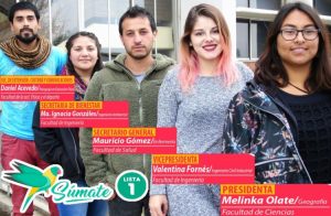 Olate, quien en 2016 fue presidenta del Centro de Estudiantes de su carrera y actualmente se encuentra apoyando dicha organización como alumna, trabajaría con Valentina Fornés, de Ingeniería Civil Industrial (vicepresidenta); Mauricio Gómez, de Enfermería (secretario general); María Ignacia Gonzáles, de Ingeniería Ambiental (secretaria de Bienestar) y Daniel Acevedo, de Pedagogía en Educación Física (secretario de Extensión y Comunicaciones).