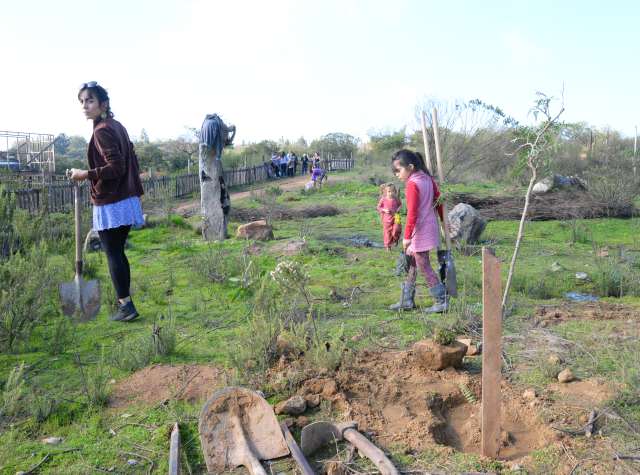 La jornada de reforestación fue la ocasión propicia para que tanto alumnos como los habitantes del sector compartieran un almuerzo –porotos con rienda- al final de los trabajos, preparado por los propios miembros de las comunidades locales. Fue un momento oportuno, además, para que los pequeños de dos escuelitas alternativas relacionadas con el lugar, aprendieran de los jóvenes y los adultos, el valor de trasplantar y proteger un árbol.