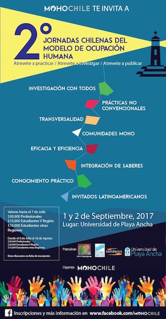 El 1 y 2 de septiembre próximo se realizarán las 2ª Jornadas Chilenas del Modelo de Ocupación Humana, que organiza el Departamento Disciplinar de Ciencias de la Ocupación humana, la carrera de Terapia Ocupacional de la UPLA y la Agrupación Modelo de Ocupación Humana en Chile.