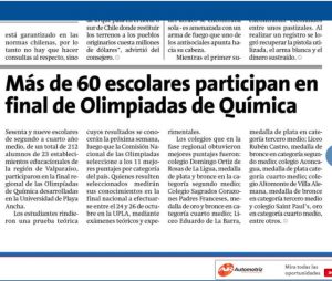 Sesenta y nueve escolares de segundo a cuarto año medio, de un total de 212 alumnos de 23 establecimientos educacionales de la región de Valparaíso, participaron en la final regional de las Olimpíadas de Química desarrolladas en la Universidad de Playa Ancha.