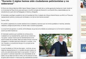“La ciudadanía tiene toda la soberanía, pero no somos conscientes de que somos soberanos y eso es un problema histórico de fondo. Tenemos que aprender a ser ciudadanos soberanos, lo cual es ir a contracorriente, porque durante 200 años hemos sido ciudadanos peticionistas. Puros pliegos de peticiones, demandas, protestas callejeras. No estamos decidiendo nada. En la Reforma Educacional no han participado los profesores, ni los alumnos, ni los trabajadores. Lo mismo ocurre en la Reforma Tributaria”.