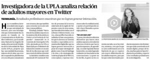 El trabajo, titulado «Narrativas de los adultos mayores en la construcción de la noticia en Twitter en la Provincia de Valparaíso»- enmarcado en el Convenio de Desempeño UPA 1301, ejecutado por la UPLA y financiado por el Ministerio de Educación-consiste en un análisis de los discursos que realizan a través de dicha red social.