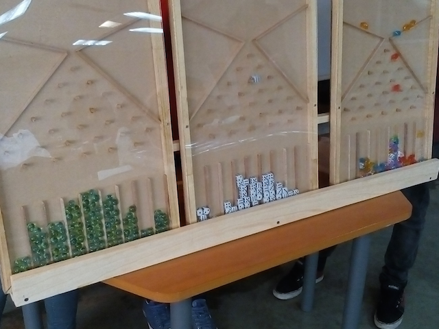 Finalmente, se presentó la propuesta de una Máquina de Galton, con materiales reciclados y obstáculos no rígidos, de tal forma de poder acceder a ella a bajo costo y visualizar el efecto del rebote en las unidades muestrales sobre la forma distribucional a la que se converge.