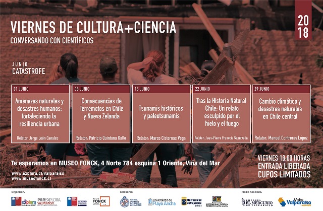 El Museo Fonck junto a PAR Explora de CONICYT Valparaíso han invitado a la comunidad para este mes a aprender y conversar en el Viernes de Cultura + Ciencia junto a académicos e investigadores de la Universidad de Playa Ancha (UPLA), Universidad Técnica Federico Santa María (USM), la Universidad de Valparaíso (UV), y la Pontificia Universidad Católica de Valparaíso (PUCV) con los siguientes temas: