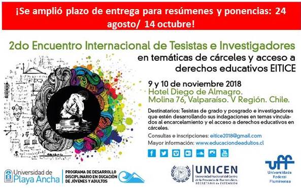 El Comité Organizador del “2° Encuentro Internacional de Tesistas e Investigadores en Temáticas de Cárceles y Acceso a Derechos Educativos, EITICE” a desarrollarse en Valparaíso el 9 y 10 de noviembre de 2018, informa los nuevos plazos para envío de resúmenes y ponencias.