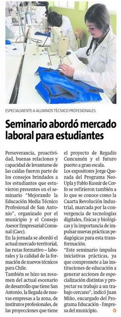 En la jornada se abordó el actual mercado territorial, las rutas formativo – laborales y la calidad de la formación de nuevos técnicos para Chile.También se hizo un resumen del actual escenario de desarrollo que tiene San Antonio, la llegada de nuevas empresas a la zona, de institutos profesionales, de las proyecciones que tiene el proyecto de Regadío Cuncumén y el futuro puerto a gran escala.