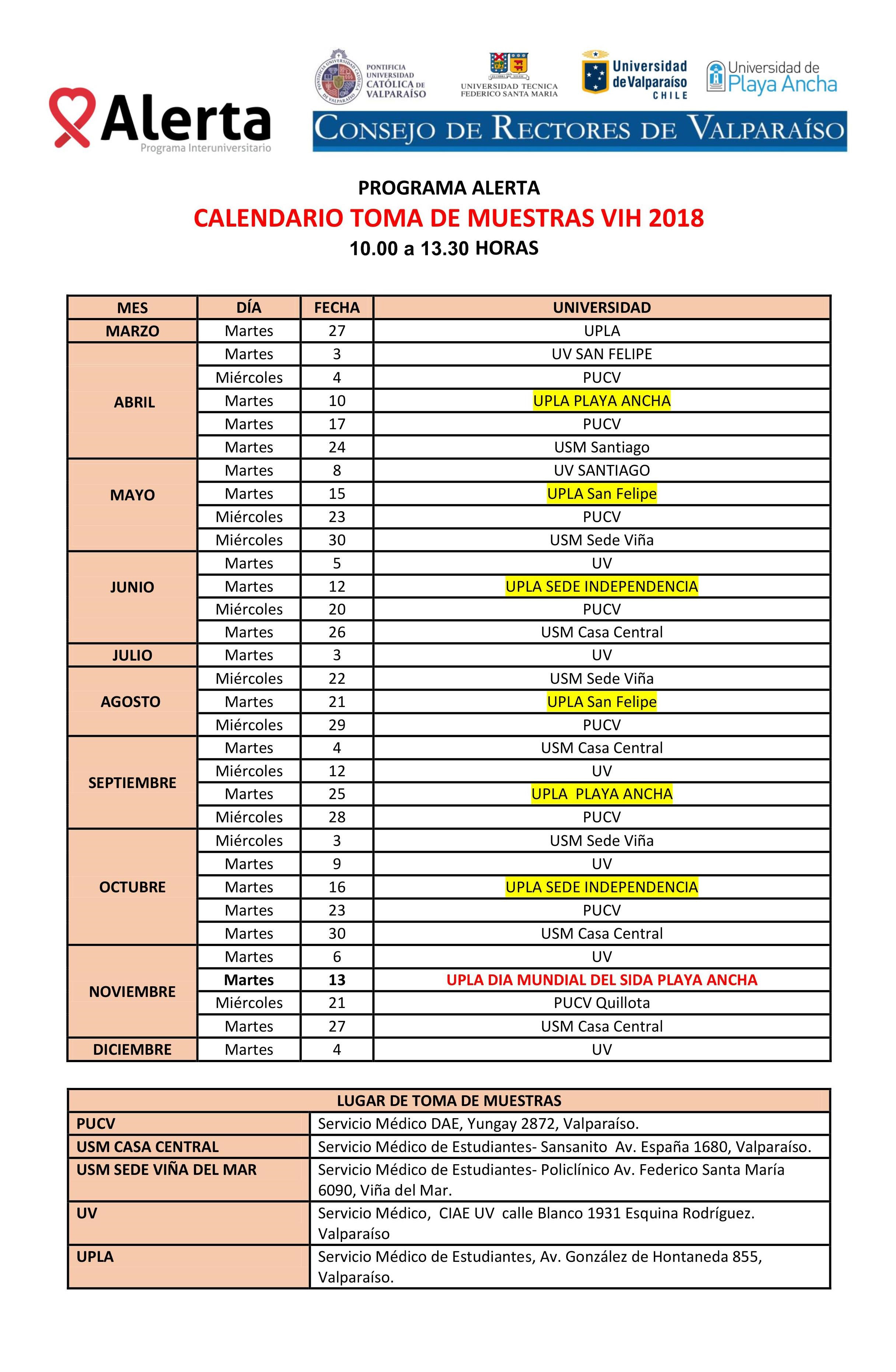Revisa el calendario anual de toma de muestras del Programa Alerta, el cual da a conocer las próximas fechas para nuestra casa de estudios y para las otras instituciones pertenecientes al Consejo de Rectores de Valparaíso, es decir: Pontificia Universidad Católica de Valparaíso, Universidad de Valparaíso y Universidad Técnica Federico Santa María.