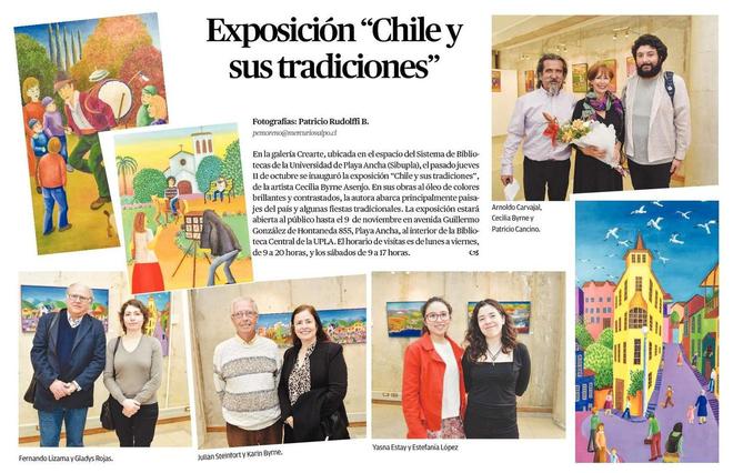 En la galería Crearte, ubicada en el espacio del Sistema de Bibliotecas de la Universidad de Playa Ancha (Sibupla), el pasado jueves 11 de octubre se inauguró la exposición «Chile y sus tradiciones», de la artista Cecilia Byrne Asenjo. En sus obras al óleo de colores brillantes y contrastados, la autora abarca principalmente paisajes del país y algunas fiestas tradicionales. La exposición estará abierta al público hasta el 9 de noviembre en avenida Guillermo González de Hontaneda 855, Playa Ancha, al interior de la Biblioteca Central de la UPLA. El horario de visitas es de lunes a viernes, de 9 a 20 horas, y los sábados de 9 a 17 horas.