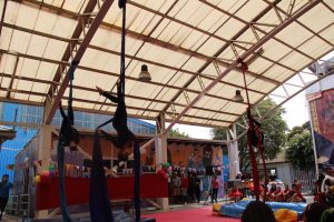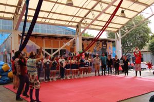 En el patio techado, estudiantes de la UPLA, liderados por Matías Orellana Recabarren, recrearon un circo que contó con presentaciones de cheerleaders, payasos, acrobacias en telas y acroyoga, números que fueron disfrutados por grandes y chicos.