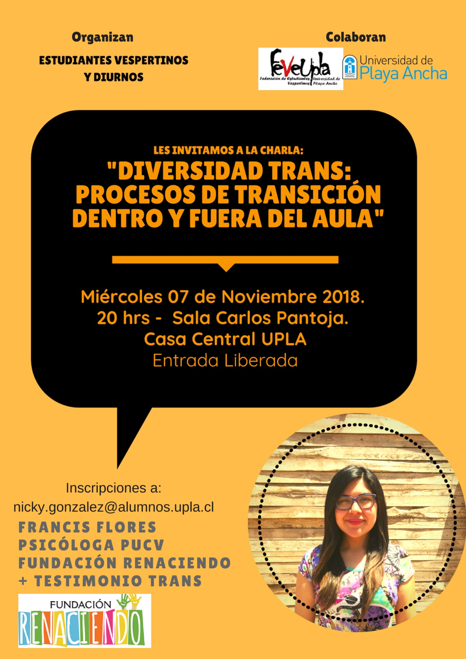 Sus organizadores invitan a estudiantes docentes, funcionarios y comunidad externa a UPLA a asistir a esta charla en que se dará a conocer el trabajo que realiza la Fundación Renaciendo vinculado con dar contención y protección a niños, niñas y adolescentes trans e intersex, además de orientar a sus familias y entorno significativo con equipos interdisciplinarios que promueven programas, asesorías, creación de proyectos, elaboración de informes presentados a nivel nacional e internacional. Junto con esto se presentará el testimonio de un adolescente transgénero.