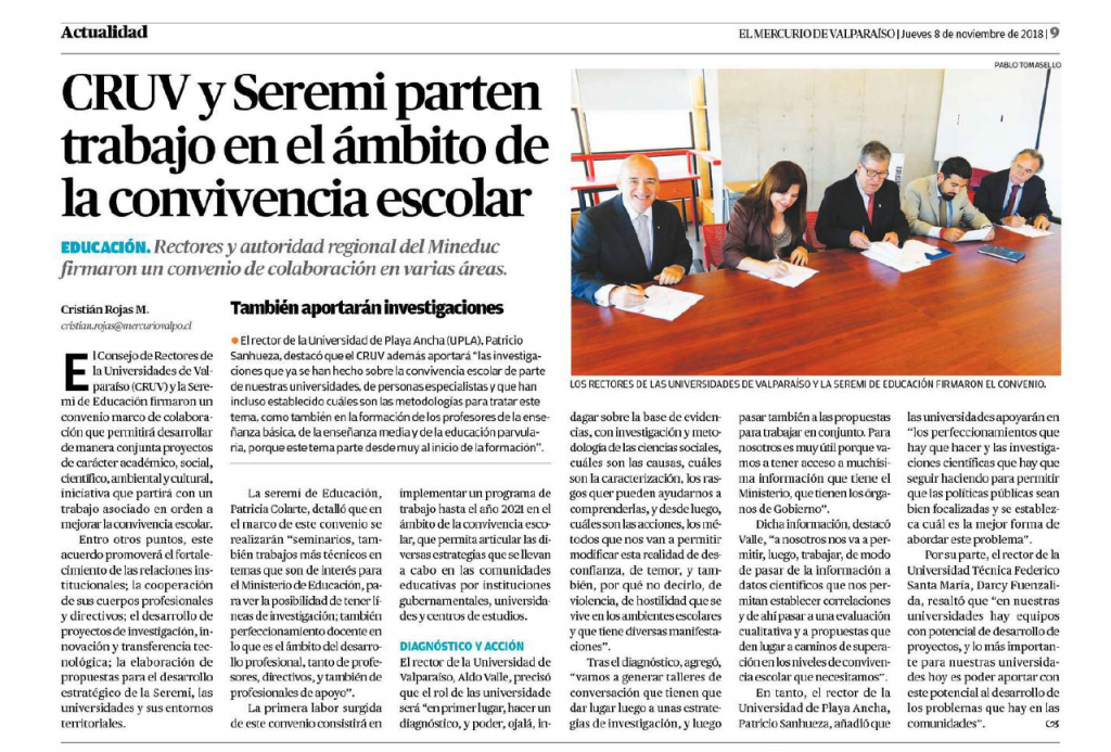 El rector de la Universidad de Playa Ancha (UPLA), Patricio Sanhueza, destacó que el CRUV además aportará «las investigaciones que ya se han hecho sobre la convivencia escolar de parte de nuestras universidades, de personas especialistas y que han incluso establecido cuáles son las metodologías para tratar este tema, como también en la formación de los profesores de la enseñanza básica, de la enseñanza media y de la educación parvularia, porque este tema parte desde muy al inicio de la formación».