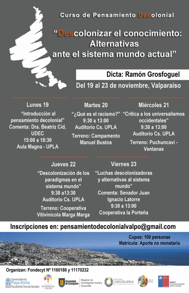 El curso requiere inscripción previa en pensamientodecolonialvalpo@gmail.com, desde esta casilla electrónica se enviará a los inscritos el programa definitivo junto al material y bibliografía del encuentro.