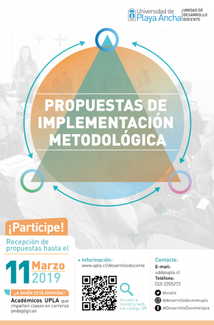 La Unidad de Desarrollo Docente invita a los académicos que imparten cursos en carreras pedagógicas a participar de las Propuestas de Implementación Metodológica año 2019, las que buscan fortalecer la creación de triadas formativas (académicos UPLA – estudiantes FID – profesores de establecimientos educacionales) en permanente vinculación con el sistema educativo.