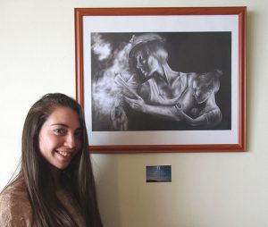 “Mi obra es un dibujo hecho con grafito y carboncillo que trabajé durante muchas horas. Está pintada sobre un fondo negro para que se interpretara como la oscuridad dentro de una cueva minera. La figura de la madre muestra el sudor producto del esfuerzo y el amor que le da a sus dos hijas mellizas, y la dedicación a su trabajo en la minería. Finalmente, la hija envuelta con vendas y con pedazos de metal representa a una persona con síndrome genético en clara alusión a una de las hijas de Cecilia Arrué que nació con esta enfermedad”, explicó la artista.