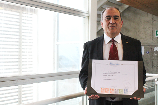 La primera semana de abril la Universidad de Playa Ancha graduó a los profesionales que cursaron alguno de los programas de doctorado, magíster, diplomados y postítulos que imparte la Escuela de Postgrado. Uno de ellos, fue el director del Departamento Disciplinario de Industria y Economía de la Facultad de Ingeniería, Luis Espinoza Brito.