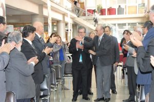 Bajo un sostenido y afectuoso aplauso de la comunidad universitaria reunida en la Biblioteca Central de la UPLA, el Dr. Larrieu visiblemente emocionado, se abrió paso entre profesores, funcionarios, exalumnos y estudiantes que lo saludaron al inicio de la ceremonia.