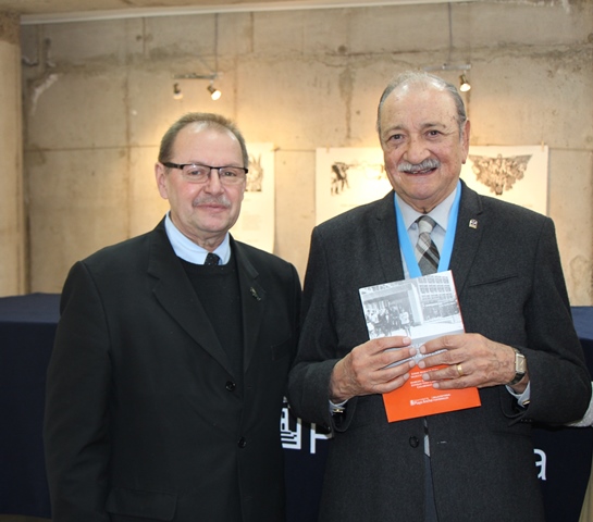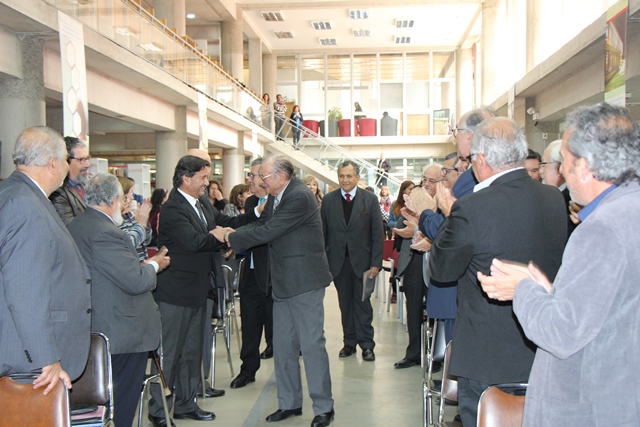 Bajo un sostenido y afectuoso aplauso de la comunidad universitaria reunida en la Biblioteca Central de la UPLA, el Dr. Larrieu visiblemente emocionado, se abrió paso entre profesores, funcionarios, exalumnos y estudiantes que lo saludaron al inicio de la ceremonia.