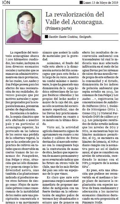 Columna de opinión publicada en diario El Trabajo de San Felipe, el lunes 13 de mayo de 2019.