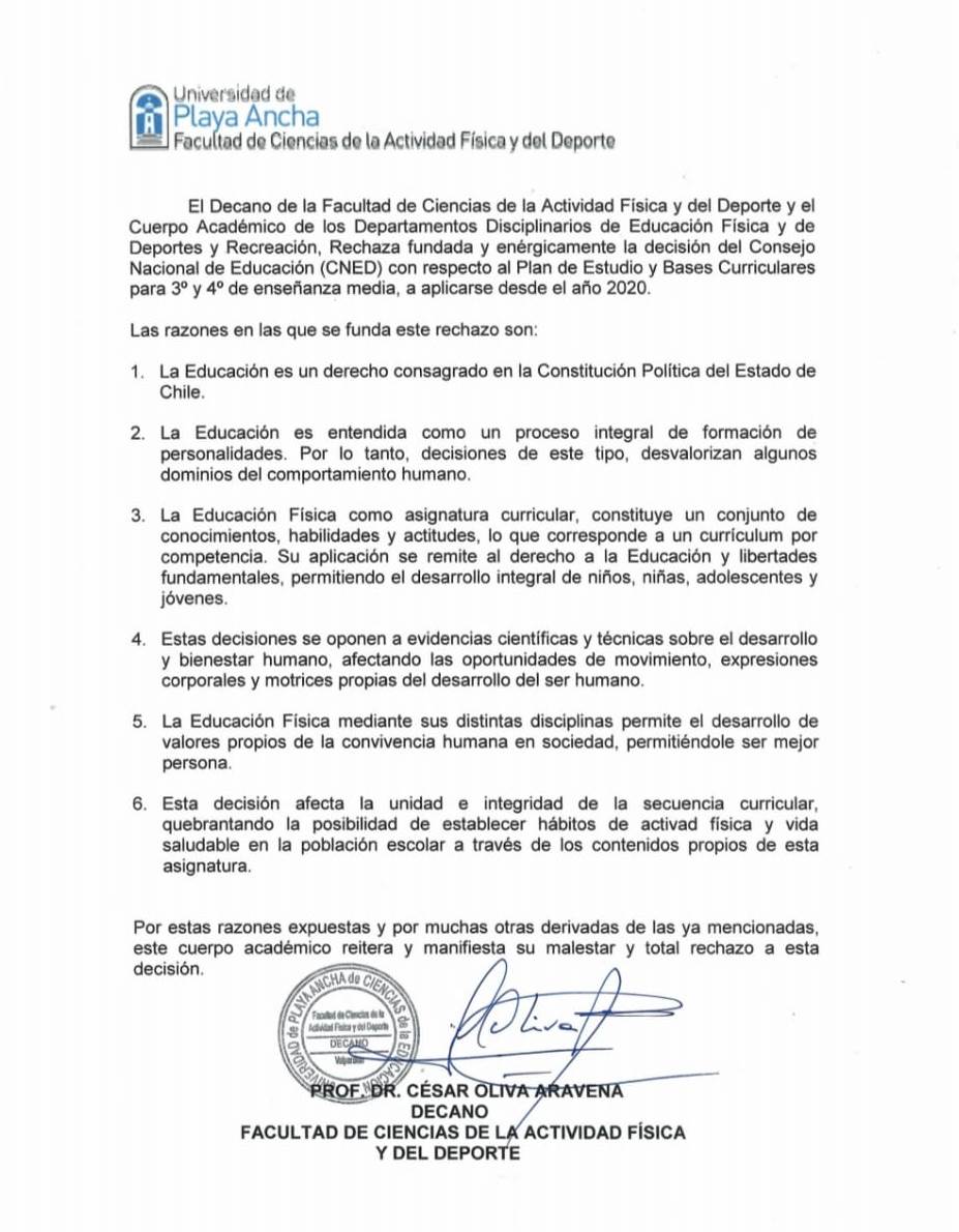 “Esta decisión afecta la unidad e integridad de la secuencia curricular, quebrando la posibilidad de establecer hábitos de actividad física y vida saludable en la población escolar, a través de los contenidos propios de esta asignatura. Estas medidas se oponen a evidencias científicas y técnicas sobre el desarrollo y bienestar humano, afectando las oportunidades de movimiento, de expresiones corporales y motrices propias del desarrollo del individuo”, explicó el director del Departamento Disciplinario de Educación Física de la UPLA, Antonio Maurer Fürst.