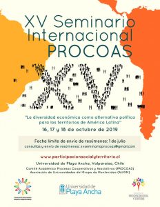 Se trata del XV Seminario Internacional del Comité Académico Procesos Cooperativos y Asociativos (PROCOAS), que organizan la Facultad de Ciencias Sociales de la UPLA, su Observatorio de Participación Social y Territorio y dicho comité de la Asociación de Universidades Grupo Montevideo (AUGM).