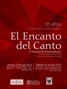 Un recorrido por las principales obras interpretadas durante su extensa trayectoria artístico-musical contempla el concierto «El Encanto del Canto”, con el cual el Conjunto de Madrigalistas de la Universidad de Playa Ancha, dirigido por el académico de la Facultad de Arte Alberto Teichelmann Shuttleton, celebrará sus 35 años de vida dedicados a cultivar e interpretar la música coral especializada.