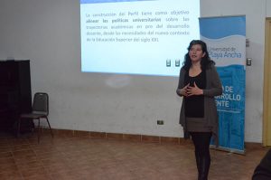 Gabriela Guerrero, académica encargada de la actividad, explicó que esta etapa comprende conversaciones con las ocho facultades de la universidad más el Campus San Felipe, y responde al Fondo de Fortalecimiento UPA 1799 para universidades estatales que propone, básicamente, alinear las políticas universitarias sobre la trayectoria académica en pro del desarrollo docente, construir el perfil definitivo y finalmente publicarlo y socializarlo.
