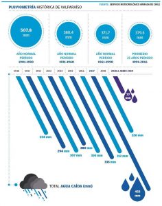 Gonzalo Espinosa detalla que del análisis de los datos de las es­taciones ubicadas en la zona central del país, “se puede inferir que este sector está pasando por una de las etapas más críticas en cuan­to a precipitaciones. Desde el año 2010 a la fecha, en que la media anual debiera estar en torno a los 400 mm (Estación Meteorológi­ca Faro Punta Ángeles de la Armada de Chile), solo 2017 superó esa medida con 453 mm anuales».