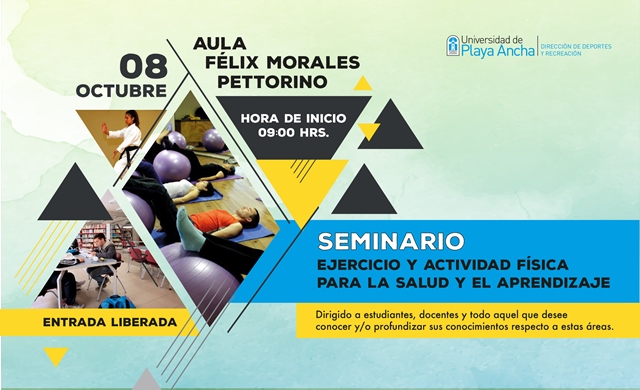 La Dirección de Deportes y Recreación de la Universidad de Playa Ancha invita a participar en el Seminario Ejercicio y Actividad Física para la Salud y el Aprendizaje, a realizarse el martes 8 de octubre, a las 9:00 horas, en el Aula Dr. Félix Morales Pettorino (Av. Playa Ancha 850. Valparaíso).