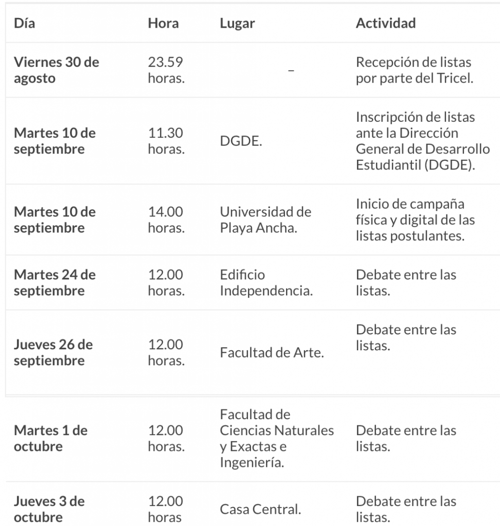 El Tribunal Calificador de Elecciones (TRICEL), conformado por estudiantes de la Universidad de Playa Ancha, informa que se dio inicio al proceso eleccionario para definir a la nueva Federación de Estudiantes (FEUPLA) por el período 2019-2020, la cual corresponde a la instancia máxima de representación y organización política y social de los estudiantes, articulando a las diversas carreras y ayudando en su cohesión, además de representar al estudiantado frente a las autoridades y/u organizaciones.