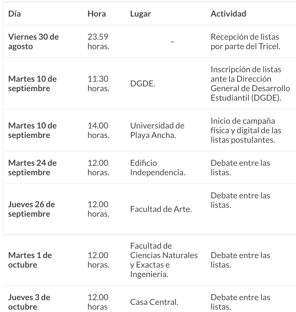 El Tribunal Calificador de Elecciones (TRICEL), conformado por estudiantes de la Universidad de Playa Ancha, informa que se dio inicio al proceso eleccionario para definir a la nueva Federación de Estudiantes (FEUPLA) por el período 2019-2020, la cual corresponde a la instancia máxima de representación y organización política y social de los estudiantes, articulando a las diversas carreras y ayudando en su cohesión, además de representar al estudiantado frente a las autoridades y/u organizaciones.