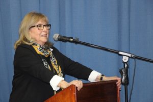 Tras recibir un ramo de flores de parte del decano de la Facultad de Humanidades, Alessandro Monteverde, quien destacó su trayectoria y compromiso con la labor académica, Cristina Orrego saludó a los presentes, visiblemente emocionada.