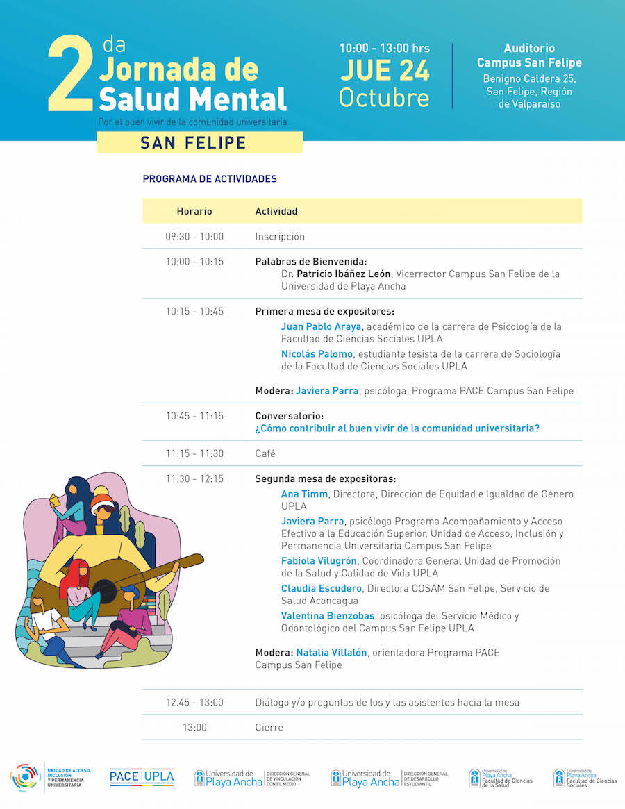 La actividad, que se realizará el próximo jueves 24 de octubre, a partir de las 09:30 horas en el auditorio del campus San Felipe, buscará también reflexionar acerca de las condiciones o variables que afectan la salud mental, identificando a través de la participación de los asistentes aspectos que pudieran orientar el diseño e implementación de actividades, estrategias o políticas que vayan en favor de fomentar prácticas y espacios de atención en este ámbito.