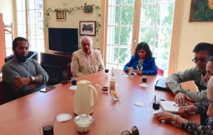 Posteriormente, la delegación se reunió con el vicerrector de Investigación, Postgrado e Innovación, Dr. José Palacio Guzmán, la directora de Relaciones Internacionales, Cecilia Arriagada y el decano Díaz, quien fue la persona que hizo el contacto inicial con la Fundación Universitaria de Popayán, cuando asistió a ella a realizar una serie de conferencias sobre comprensión lectora.