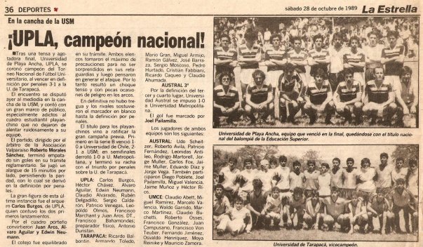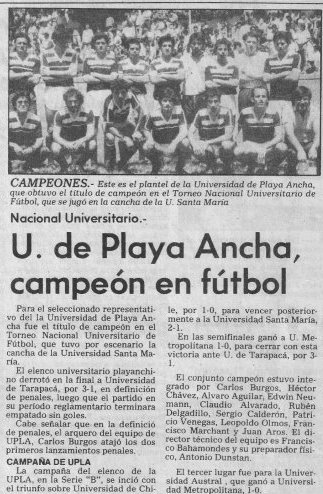 Corría el año 1989 cuando el equipo de fútbol de la Universidad de Playa Ancha alzó por primera vez la copa del Torneo Nacional Universitario de Fútbol, tras enfrentar a la Universidad de Tarapacá (UTA) y derrotarla por 3-1 en definición a penales.