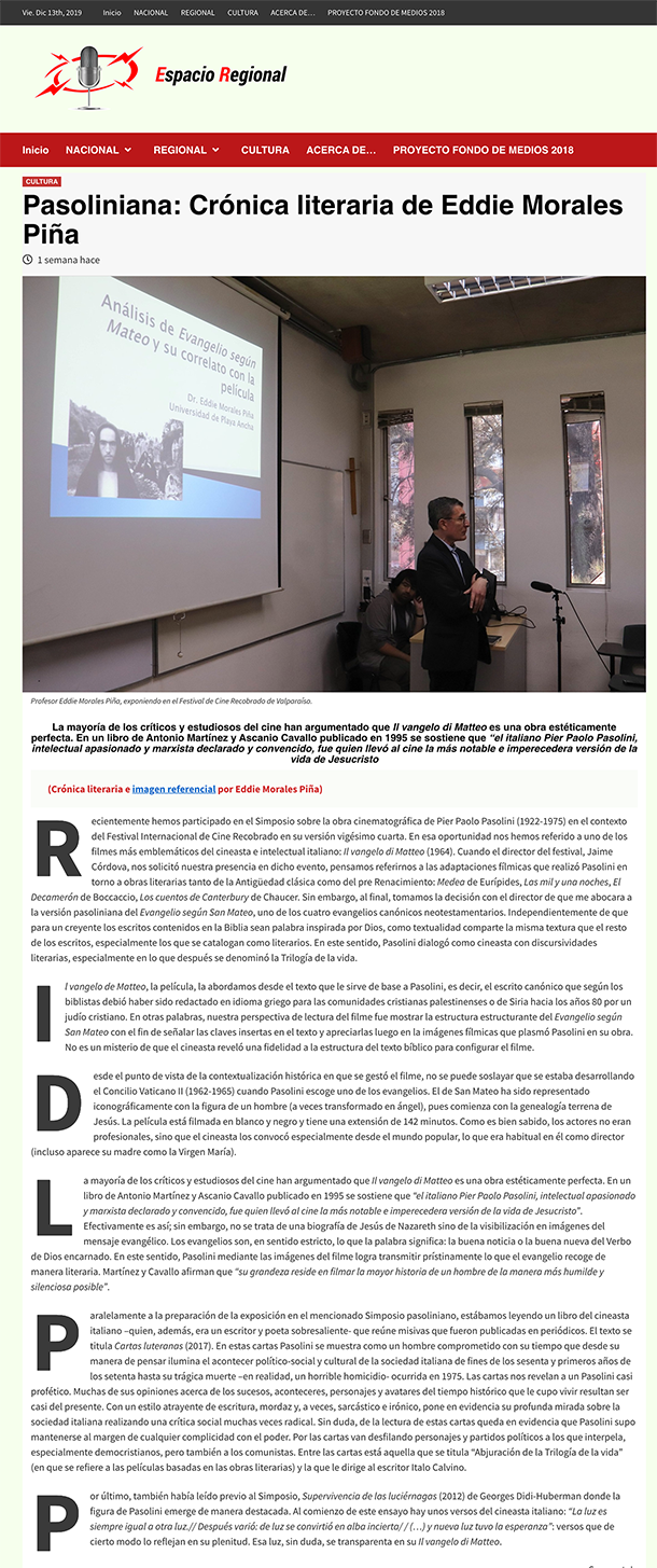 Recientemente hemos participado en el Simposio sobre la obra cinematográfica de Pier Paolo Pasolini (1922-1975) en el contexto del Festival Internacional de Cine Recobrado en su versión vigésimo cuarta. En esa oportunidad nos hemos referido a uno de los filmes más emblemáticos del cineasta e intelectual italiano: Il vangelo di Matteo (1964). Cuando el director del festival, Jaime Córdova, nos solicitó nuestra presencia en dicho evento, pensamos referirnos a las adaptaciones fílmicas que realizó Pasolini en torno a obras literarias tanto de la Antigüedad clásica como del pre Renacimiento: Medea de Eurípides, Las mil y una noches, El Decamerón de Boccaccio, Los cuentos de Canterbury de Chaucer. Sin embargo, al final, tomamos la decisión con el director de que me abocara a la versión pasoliniana del Evangelio según San Mateo, uno de los cuatro evangelios canónicos neotestamentarios. Independientemente de que para un creyente los escritos contenidos en la Biblia sean palabra inspirada por Dios, como textualidad comparte la misma textura que el resto de los escritos, especialmente los que se catalogan como literarios. En este sentido, Pasolini dialogó como cineasta con discursividades literarias, especialmente en lo que después se denominó la Trilogía de la vida.