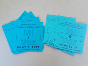 Posteriormente, y al son del “Cacerolazo” de Ana Tijoux se hizo una segunda dinámica en que cada participante entregó “su voz/tarjeta” a la persona de su confianza o a quien le preguntaría por el resultado de una asamblea. En los tres minutos de canción los participantes recorrieron la sala buscando a quien entregar su voz. Posteriormente, el equipo que trabaja con el profesor Guevara sistematizó la información de cada uno de los sobres, lo que llevó a un esquema de red de personas, que permitió saber que entre las mujeres presentes, quien más confianzas había recibido era la exacadémica de la Facultad de Humanidades, María Cristina Huerta.