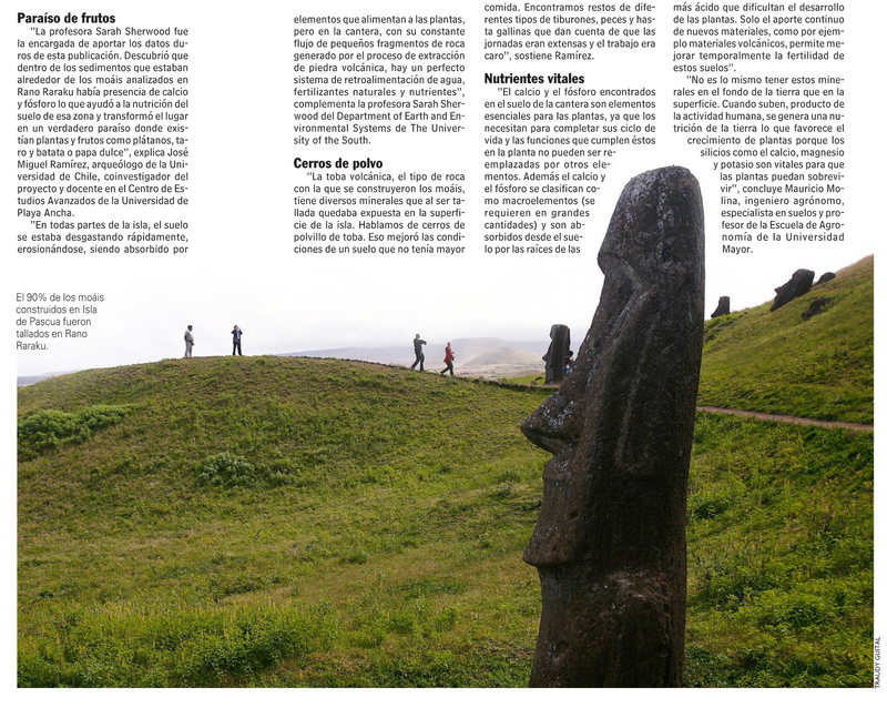 «La profesora Sarah Sherwood fue la encargada de aportar los datos duros de esta publicación. Descubrió que dentro de los sedimentos que estaban alrededor de los moáis analizados en Rano Raraku había presencia de calcio y fósforo, lo que ayudó a la nutrición del suelo de esa zona y transformó el lugar en un verdadero paraíso donde existían plantas y frutos como plátanos, taro y batata o papa dulce”, explica José Miguel Ramírez, arqueólogo de la Universidad de Chile, coinvestigador del proyecto y docente en el Centro de Estudios Avanzados de la Universidad de Playa Ancha.