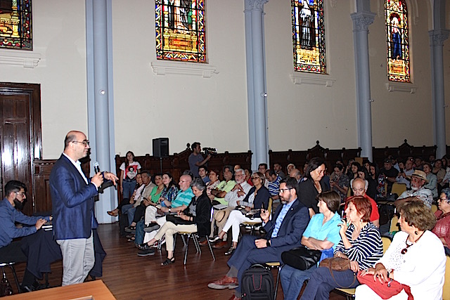 Juan Álvarez, entrega al expositor el libro Alemanes en Valparaíso.