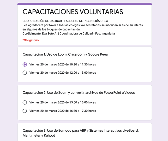 Son tres bloques de capacitación: el primero contempla la enseñanza de tres herramientas Loom (que permite grabar y compartir videos), Classroom (para crear clases virtuales) y Google Keep (agenda virtual). En el segundo se hablará de la plataforma para videoconferencias Zoom y se enseñará a convertir archivos de Power Point a vídeos.