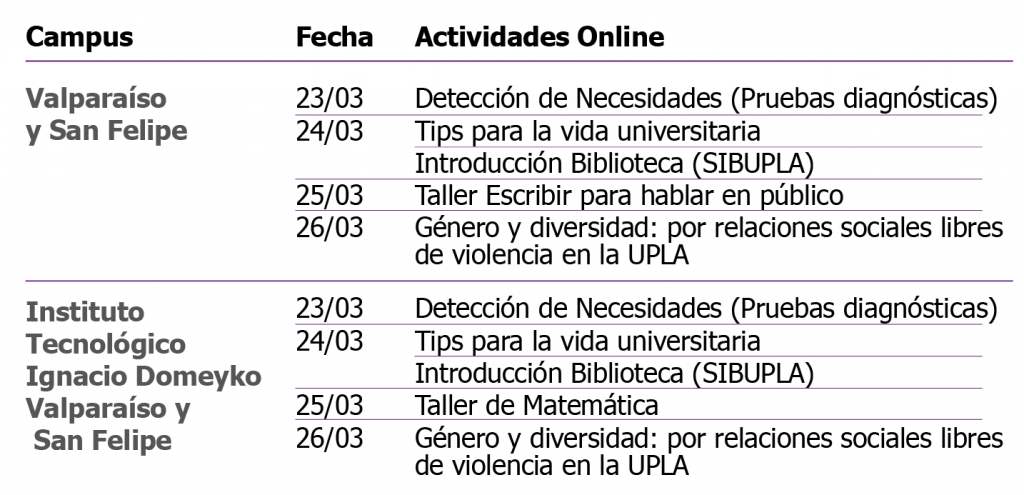 Este año se realizarán tres talleres a los nuevos estudiantes: Tips para la vida universitaria (martes 24), Escribir para hablar en público (miércoles 25) y Género y diversidad: por relaciones sociales libres de violencia en la UPLA (jueves 26). Cada uno se activará en E-Aula en la fecha fijada, por lo que solo basta acceder a esa plataforma siguiendo las instrucciones generales ya dadas.